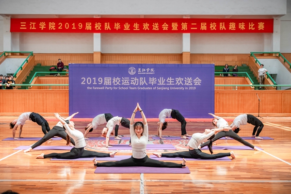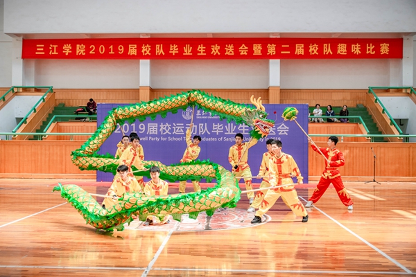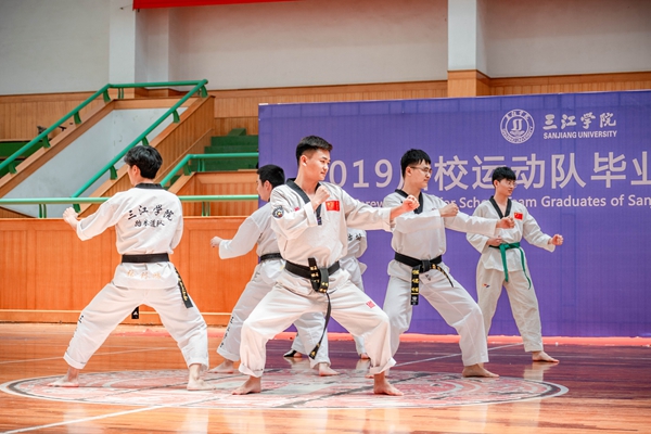 体育部群体教研室主任周会俭代表体育部向此届优秀运动员毕业生致辞。感谢他们对待体育学习的那份热爱和顽强拼搏的精神,感谢在教员辛勤的指导下不断成长的步伐,更是感谢在这短暂的四年里通过自己的努力为母校争光,为团队添彩。而后,他也为在场毕业生送去最真挚的祝福,当他们离开学校步入职场的时候能够依然记得那份曾经的拼搏进取之心。在未来的道路上也希望毕业生们能够学有所用,学有所成,用知识武装自己,汗水和自信就是自己最坚实的铠甲。而后2019届运动员毕业生代表、跆拳道队队员赵慧同学也发表了自己的毕业感言,回顾自己四年来在赛场的奋战历程,对学校的眷恋,对同学的不舍,以及对老师的感恩之情。铭记母校,不忘初心,终身都是三江人!最后颁奖嘉宾为运动员毕业生们颁发纪念奖杯,并和队员进行合影留念,共筑一份美好回忆。为了鼓舞在场运动员们的士气,校跆拳道队,校瑜伽队,校羽毛球队乒乓球队以及校舞龙队分别在台上进行了精彩纷呈的才艺展示。一时间掌声欢呼声响彻场馆,好不热闹!