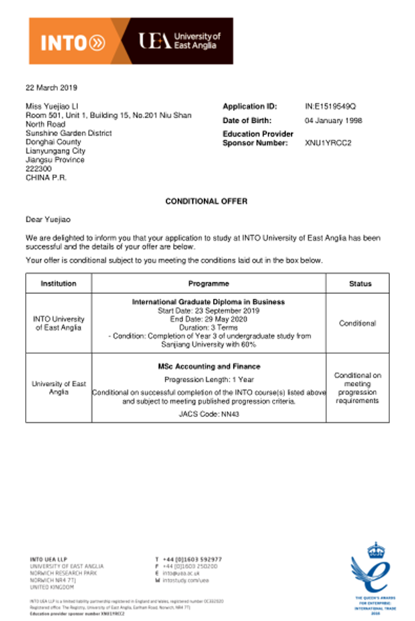 李月佼同学被东英吉利亚大学录取,雅思6.5,GPA 3.15,东英吉利亚大学是世界大学学院中的前1%学校,在教学和科研等诸多领域都有着辉煌的成就。学校重视学业教育,给学生们提供非常好的学习环境和氛围来使学生们投入到学业研究上。就业率十分可观,近90%的研究项目处于世界优秀,其中50%处在世界领先位。