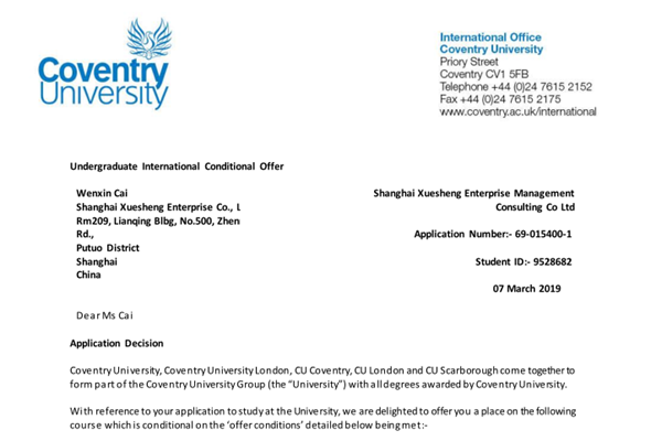 蔡文欣同学,雅思6.5,GPA3.2,被英国考文垂大学录取,该校在《卫报》2019大学综合排名据第13名,热门专业是会计和金融,Accounting and Finance。英国教学质量QAA评估满分24分;也是ACCA Gold Status 合作机构,本科毕业生可享受9门ACCA注册会计师考试资格,这也是会计学专业学生选择的热门。另外艺术设计,尤其是在工业产品设计方向,考文垂大学都是首屈一指的。大学最突出的专业是汽车工程和汽车设计专业,高居全英第一、全球第三的顶尖水平。