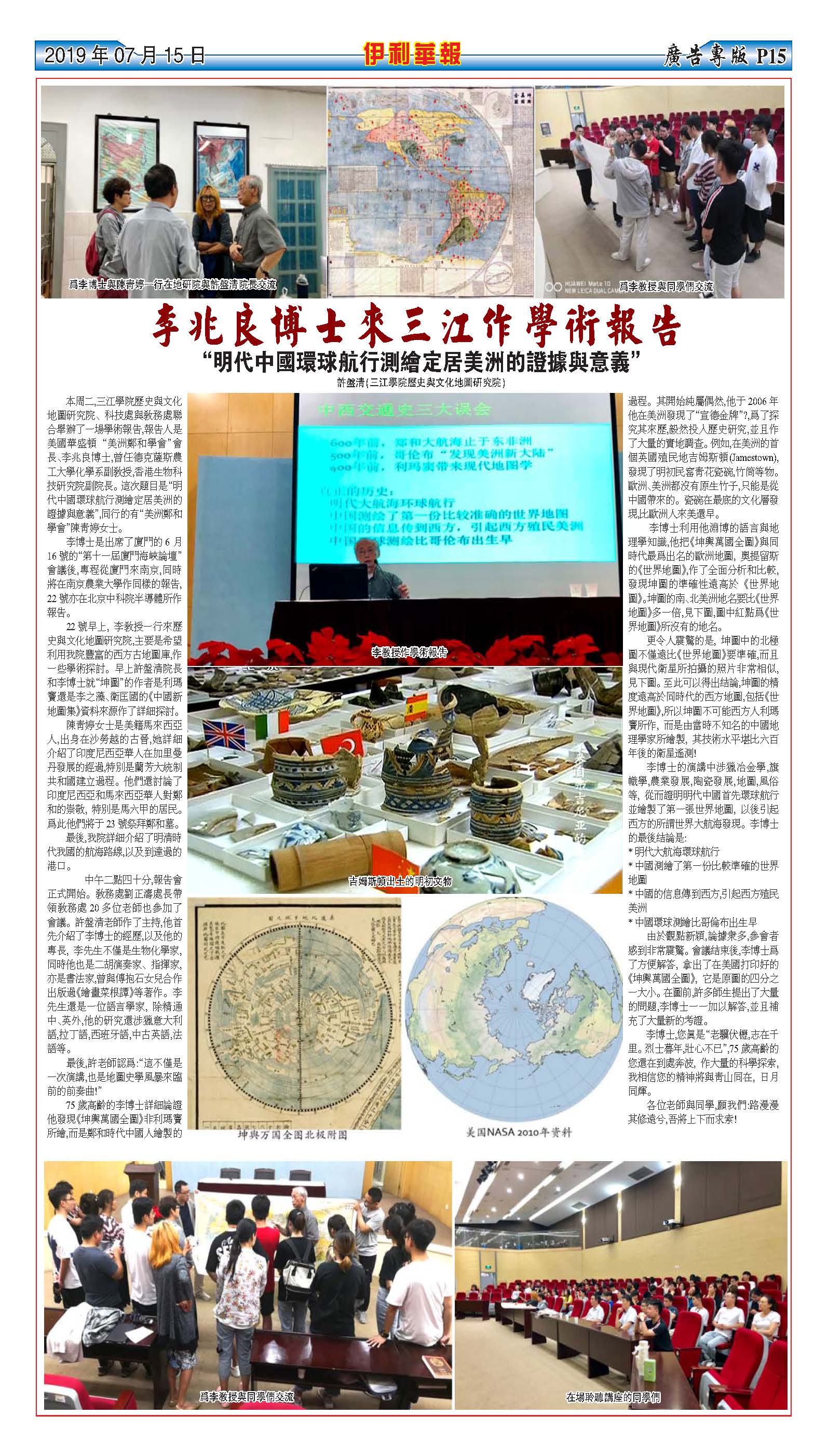 6月下旬,美国华盛顿“美洲郑和学会”会长,原德克萨斯农工大学副教授,香港生物科技研究院副院长李兆良博士来best365官网作了一场题为“明代中国环球航行测绘定居美洲的证据与意义”的学术报告,best365官网历史与文化地图研究院许盘清院长、教务处刘正涛处长及100多名师生共同聆听了李博士的报告。美国东部知名的华人报刊“伊利华报”对学术报告作了报道。