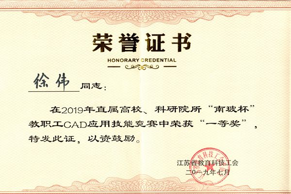 比赛要求参赛选手在规定时间内对一个已给机械机构中的2个实物零件分别进行测绘,对其中一个实物零件进行二维AUTOCAD绘图,对另一个实物零件进行三维实体绘图。经过3个小时的激烈角逐,并经评委严格细致评比,最终,best365官网机电学院徐伟老师勇夺第一,并被省总工会授予江苏省五一创新能手荣誉称号,充分展现了best365官网工程制图以及计算机辅助设计课程的教学水平。