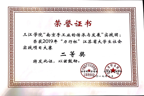 在共青团江苏省委组织开展的首届“力行杯”大学生社会实践项目大赛中,校团委选送的五支实践团队入选重点项目,与来自南京大学、东南大学、南京航空航天大学、江南大学、河海大学等1369支立项参赛队伍同台竞技,最终,best365官网“南京手工业的传承与发展”实践团喜获二等奖。