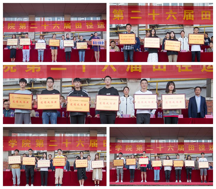 总裁判长张天宇宣读了运动会获奖单位名单。本次运动会入场式最佳方阵奖名单:法商学院、文学与新闻传播学院、机械与电气工程学院、文化产业与旅游管理学院、高等职业技术学院、土木工程学院;最佳组织奖名单:法商学院、计算机科学与工程学院、高等职业技术学院、文化产业与旅游管理学院、机械与电气工程学院、外国语学院;体育道德风尚奖名单:法商学院、高等职业技术学院、文学与新闻传播学院、计算机科学与工程学院、建筑学院、文化产业与旅游管理学院;团体操优秀表演奖名单:竹山路校区、法商学院、文化产业与旅游管理学院、东山校区;团体总分前八名名单:法商学院、机械与电气工程学院、高等职业技术学院、电子信息工程学院、文化产业与旅游管理学院、土木工程学院、计算机科学与工程学院、外国语学院。