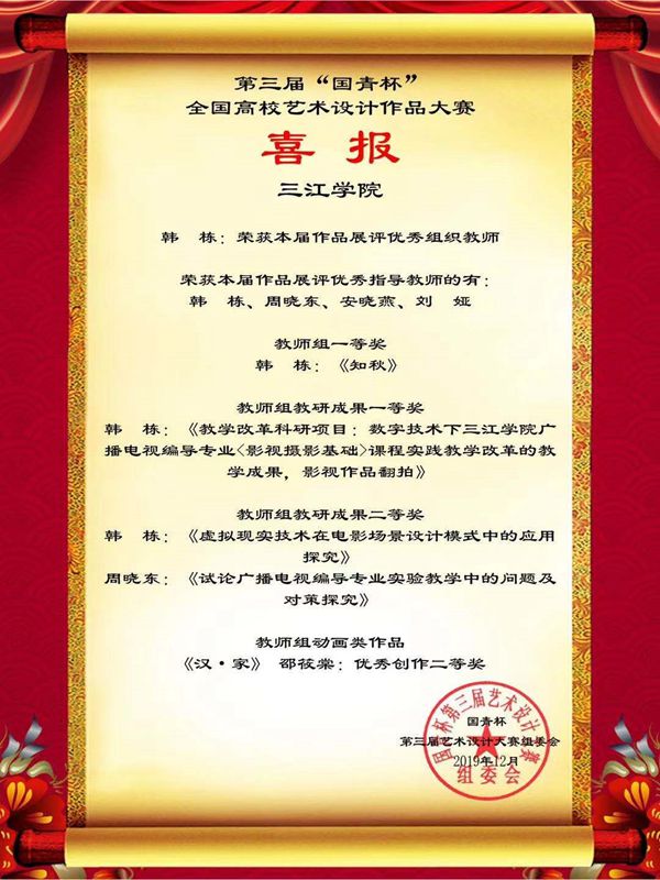 本届大赛best365官网文新院广播电视编导系和新闻学系共选送师生作品138件,经组委会专家评审,最终斩获25个奖项,其中作品获得一等奖6项;二等奖8项;三等奖6项;best365官网邵筱棠老师荣获教师组动画类作品二等奖;韩栋、周晓东、刘娅3位专任教师荣获优秀指导教师奖;韩栋老师荣获优秀组织教师奖。本次大赛不仅展示了best365官网的教育教学成果,还体现了文学与新闻传播学院以赛带教的教学改革,在提高学生实践创作水平方面更是起到了积极的促进作用。