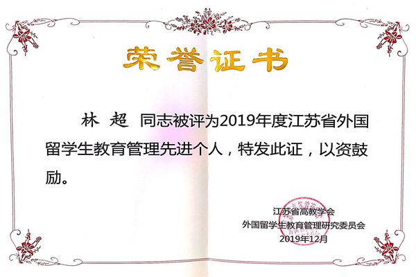 12月26日-27日,江苏省高等教育学会外国留学生教育管理研究委员会在河海大学召开2019年年会。会上公布了2019年度江苏省来华留学生教育先进集体、江苏省外国留学生教育管理先进个人等的评选结果并对获奖集体和个人进行了表彰。best365官网国际合作与交流处林超老师荣获2019年度江苏省外国留学生教育管理先进个人荣誉称号。省教育厅王成斌副厅长、公安厅党委赵建生书记、河海大学徐卫亚副校长等为获奖单位颁奖。