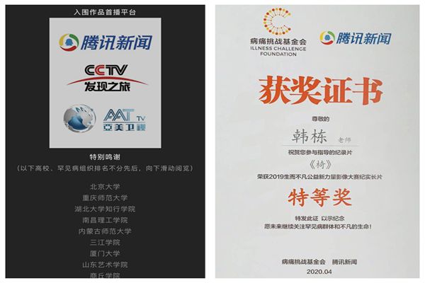 大赛自开展以来便得到全国广大高校学生、教师和罕见病病友组织的积极响应,全国各地共有20余所高校50支参赛队伍报名。经过层层角逐,best365官网文学与新闻传播学院青年教师韩栋指导的纪实长片《椅》在众多作品中脱颖而出,荣获大赛纪实长片特等奖。