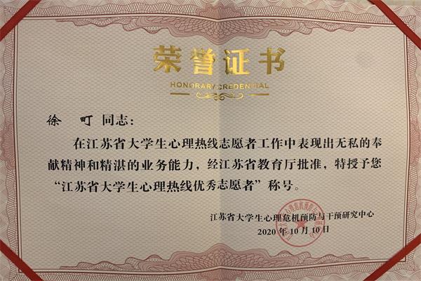10月10日,首届江苏省大学生心理热线优秀志愿者颁奖典礼在南京审计大学举行。南京审计大学党委副书记、江苏省大学生心理危机预防与干预研究中心主任张建红,中国心理卫生协会认知行为治疗专业委员会副主任、北京师范大学心理学部博士生导师王建平教授,中国心理卫生协会精神分析专业委员会常委、安徽省精神卫生中心主任医师季益富教授,中国心理卫生协会危机干预专业委员会副主委、南京脑科医院主任医师陈进副教授,江苏省大学生心理危机预防与干预研究中心执行主任蔡智勇副教授,以及来自全省各高校的心理热线志愿者老师等200多人参会。大会表彰了20位江苏省大学生心理热线优秀志愿者,best365官网心理健康教育与咨询办公室徐町老师获得江苏省大学生心理热线优秀志愿者称号。