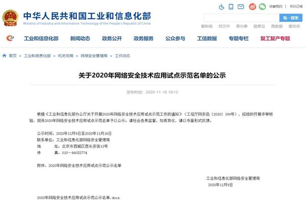 11月10日,工业和信息化部网络安全管理局根据《工业和信息化部办公厅关于开展2020年网络安全技术应用试点示范工作的通知》(工信厅网安函(2020)190号),经组织开展评审核验,对2020年网络安全技术应用试点示范名单予以公示,发布《关于2020年网络安全技术应用试点示范名单的公示》。