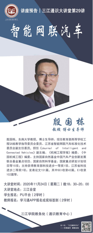 大讲堂专家:殷国栋,博士,东南大学教授,博士生导师, 机械工程学院副院长。现任教育部高等学校工程训练教学指导委员会委员、江苏省智能网联汽车标准化技术委员会副主任委员、江苏省汽车工程学会副理事长。近五年主要从事新能源与智能网联汽车、车辆动力学及控制、智能制造等研究。主持国家自然基金中国汽车产业创新发展联合基金重点项目、国家自然科学基金、国家重点研发计划项目等15项;主持获得教育部科技进步一等奖1项、江苏省科技进步二等奖1项;担任《Journal of Intelligent and Connected Vehicles》副主编、《机械工程学报》编委、《中国机械工程》编委。发表论文151篇,其中SCI 收录42篇,EI收录102篇,编著和译著6部,授权发明专利16件,受理38件。
