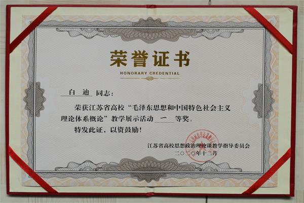 本次教学展示活动自今年9月份启动以来,全省各本科高校共90多名教师参加初赛,采取提交“微课视频”与“现场授课”展示的形式,分省内本科院校推荐、专家组两轮评审筛选、现场教学展示三个阶段,最终白迪老师与来自东南大学、南京师范大学、河海大学、苏州大学等高校的24名教师一同入围决赛。决赛现场展示采用抽签决定出场次序和讲授专题,经过紧张激烈的比拼,白迪老师荣获“毛泽东思想和中国特色社会主义理论体系概论”教学展示活动一等奖。