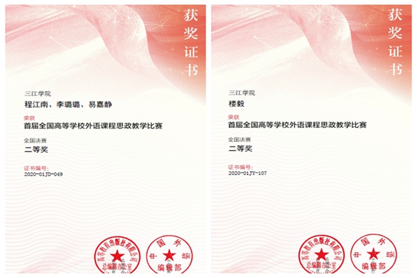 2020年12月,由高等教育出版社与《中国外语》编辑部共同主办的“首届全国高等学校外语课程思政教学比赛”圆满结束,best365官网外国语学院楼毅、程江南等老师分别获得本科英语类专业组全国二等奖、本科大学英语组全国二等奖的好成绩。本次大赛旨在全面贯彻落实中共中央办公厅、国务院办公厅印发的《关于深化新时代学校思想政治理论课改革创新的若干意见》和教育部印发的《高等学校课程思政建设指导纲要》的精神,促使各级各类外语课程与思想政治理论课同向同行,进一步发挥外语课程在立德树人方面的积极作用,全面提升高校外语教师课程思政教学能力。