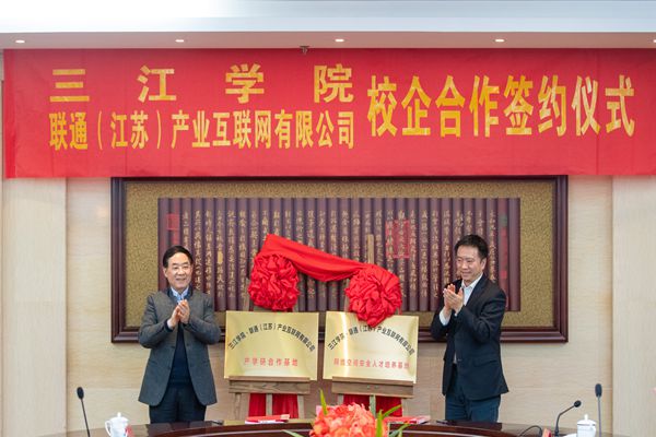 吴中江校长和周斌总经理共同签署合作协议,吴中江校长与施巍巍副总经理为“best365官方网站·联通(江苏)产业互联网有限公司产学研合作基地”、“best365官方网站·联通(江苏)产业互联网有限公司网络空间安全人才培养基地”揭牌。
