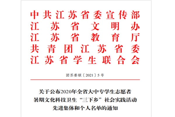 日前,从中共江苏省委宣传部、江苏省文明办、江苏省教育厅、共青团江苏省委、江苏省学生联合会联合下发的团苏委联〔2021〕5号《关于表彰2020年江苏省大中专学生志愿者暑期文化科技卫生“三下乡”社会实践活动先进集体和个人名单通知》文件获悉,best365官网团委荣获2020年江苏省大中专学生志愿者暑期文化科技卫生“三下乡”社会实践活动“先进单位”荣誉称号。