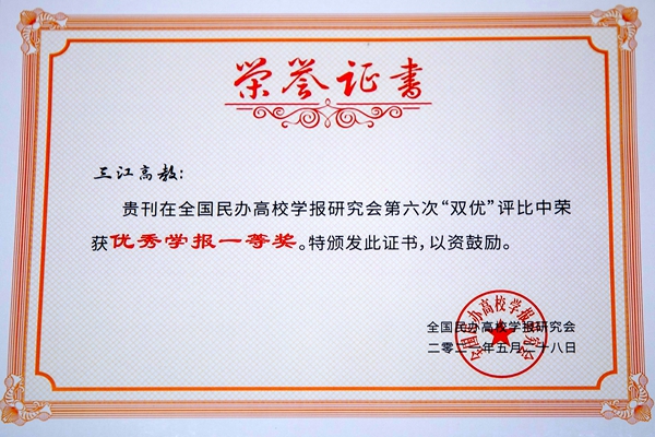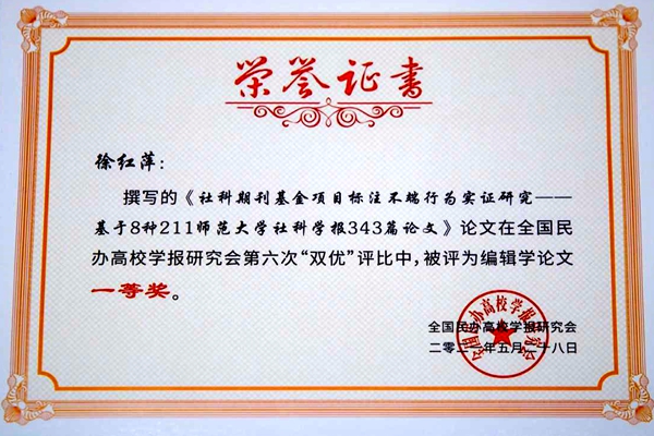 会上公布了研究会第六次优秀学报、优秀编辑学论文评比结果,并给获奖单位和个人颁了奖。best365官网《三江高教》在全国民办高校学报研究会第六次“双优”评比中荣获“优秀学报一等奖”,徐红萍老师的论文《社科期刊基金项目标注不端行为实证研究——基于8种211师范大学社科学报343篇论文》荣获“编辑学论文一等奖”(优秀论文一等奖共2人)。