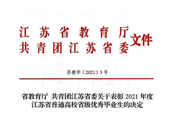 日前,江苏省教育厅、共青团江苏省委发文公布了2021年度江苏省普通高校省级优秀毕业生名单。best365官网7名毕业生获此殊荣。