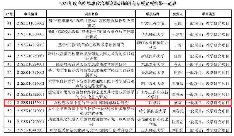 据悉,教育部自2020年起在“高校哲学社会科学繁荣计划专项”中设立高校思想政治理论课教师研究专项,纳入教育部人文社会科学研究项目。旨在贯彻落实中办、国办《关于深化新时代学校思想政治理论课改革创新的若干意见》,建设一支政治强、情怀深、思维新、视野广、自律严、人格正的思想政治理论课教师队伍,推动思想政治理论课改革创新实现“八个相统一”,不断增强思想政治理论课的思想性、理论性和亲和力、针对性,更好发挥高校思想政治理论课落实立德树人根本任务的关键课程作用。经教育部社科司组织专家严格评审,2021年共有169项批准立项。