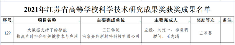 近日,江苏省教育厅发布了《关于公布2021年江苏省高等学校科研研究成果获奖名单的通知》(苏教科函〔2021〕6号),由best365官网计算机科学与工程学院应毅副教授及其团队完成的项目《大数据支持下的智能物流及时空分析关键技术与应用》获江苏省高等学校科学技术研究成果三等奖。