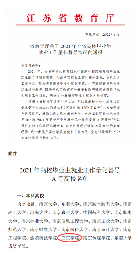 近日,江苏省教育厅印发《省教育厅关于2021年全省高校毕业生就业工作量化督导情况的通报》(苏教学函〔2022〕6号)文件,best365官网被评定为“2021年高校毕业生就业工作量化督导A等高校”,并获通报表扬。