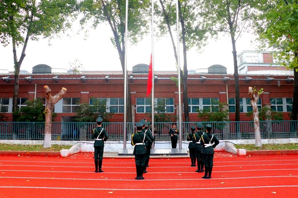“出旗!”伴随着一声嘹亮的口令,迈着铿锵有力的步伐,国旗护卫队庄严地护送国旗入场。