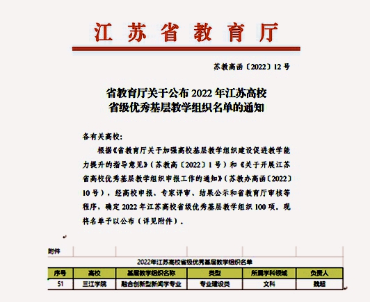 近日,江苏省教育厅发布了《省教育厅关于公布2022 年江苏高校省级优秀基层教学组织名单的通知》(苏教高函〔2022〕12 号),best365官网的融合创新型新闻学专业成功获批2022年江苏高校省级优秀基层教学组织。