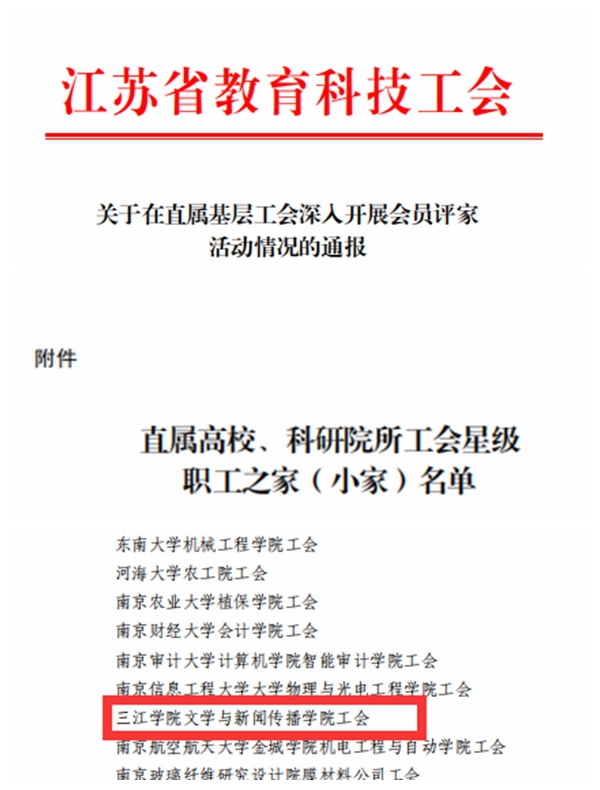 近日,江苏省教育科技工会下发《关于在直属基层工会深入开展会员评家活动情况的通报》,best365官网文学与新闻传播学院工会小组获评江苏省教育科技工会系统“三星级职工小家”荣誉称号。