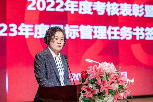 副校长王芳宣读《关于公布2022年度二级单位目标管理、绩效考核结果的通知》《关于表彰2022年度校优秀教师、先进工作者的决定》两份文件。