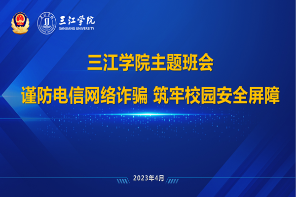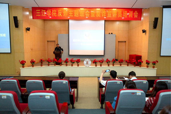 为进一步预防和减少学校电信网络诈骗案件的发生,切实提高广大师生自觉防范电信网络诈骗意识。4月18日下午,在学术报告厅举办了反诈主题班会暨反诈宣讲员培训会,南京市公安局雨花台分局内保大队教导员路海云、四级高级警长姜斌、学生发展与服务中心主任周学军、保卫处处长刘松伟以及全体辅导员参加了会议。