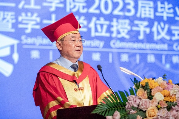 吴中江用三个愿望与毕业生共勉。他说:请珍惜青春之时光,勿忘奋进之志向,擦亮奋斗之底色,愿你们向真而行,保持青春奋进之激情;请涵养情怀,保持专注,学会坚守,愿你们向美而行,强化为人做事之本色;请保持学习热情,厉行知行合一,勇于求新图变,愿你们向新而行,保持勤学精进之定力。
