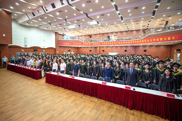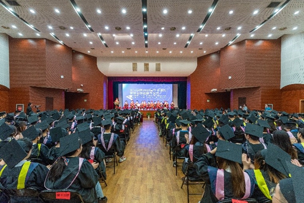 毕业典礼在雄壮的国歌声中拉开帷幕。