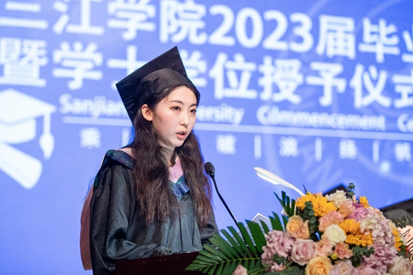 考取英国伦敦大学研究生的毕业生代表、法商学院2023届毕业生刘忆思同学深情讲述了她难忘的三江记忆,道出了学子们的三江情怀。