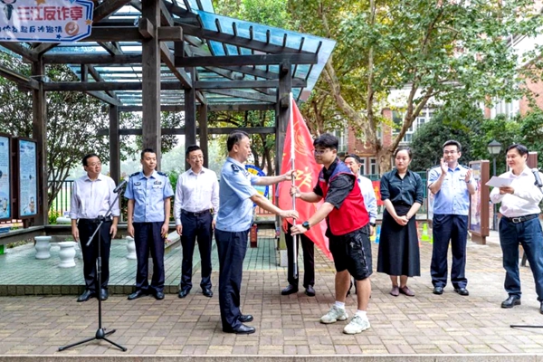 秦雪峰为best365官方网站反诈宣传员队伍授旗。现场反诈宣传员穿着鲜红的马甲与以蓝色为主调的主题公园相衬,为仪式现场再添一分青春热情。