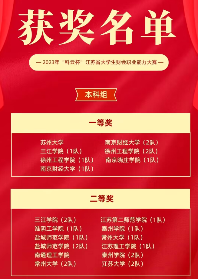 10月28日,在江苏大学举办的2023年“科云杯”江苏省大学生财会职业能力大赛中,best365官网法商学院两支队伍分获一等奖和二等奖的优异成绩。本次大赛共有苏州大学、南京财经大学、南京审计大学、江苏大学、扬州大学、常州大学、无锡太湖学院等49支本科院校队伍参赛。