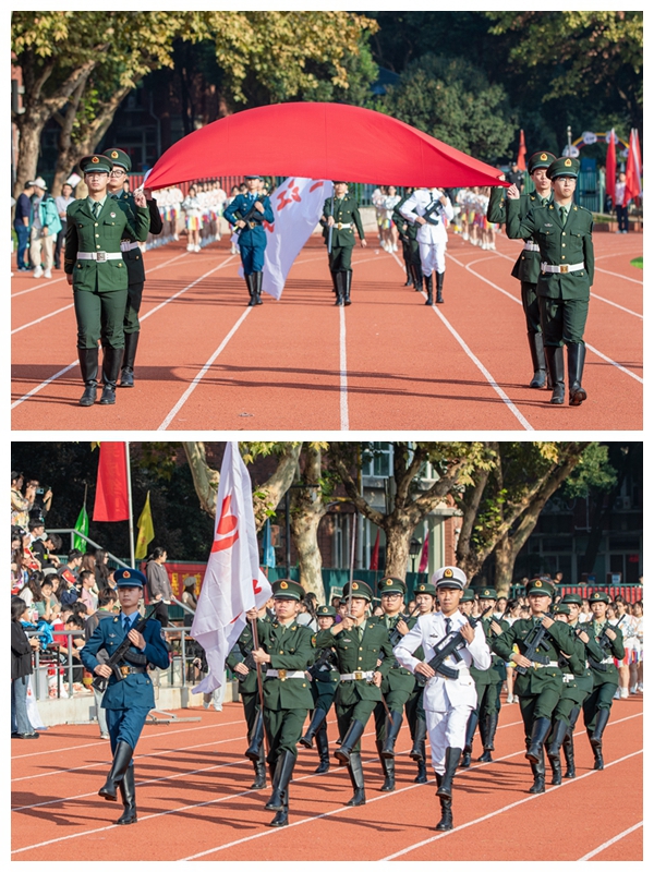 伴着雄壮有力的运动员进行曲,护旗方阵、红旗方阵、鲜花方阵及各学院运动员方阵迈着矫健的步伐入场,喊着响亮的口号,整齐有序地通过主席台。