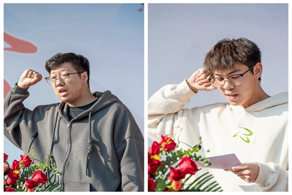 裁判员代表薛天瑞老师和运动员代表胡辰阳同学分别宣誓。