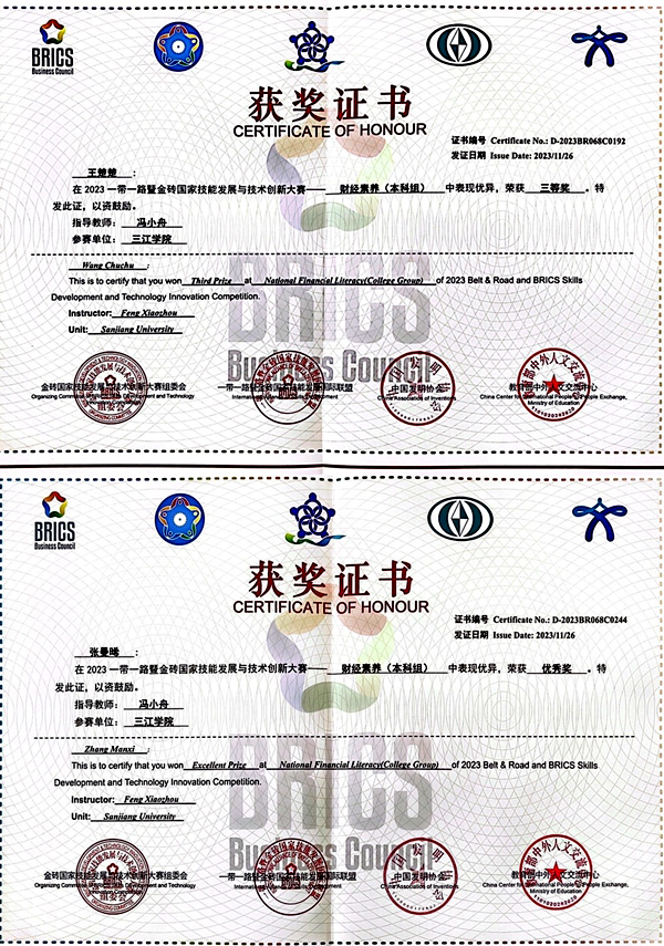 比赛中,本科组国内一共参赛77个学校148名学生;国际组一共3个学校7名学生。经过激烈角逐,best365官网法商学院2022级互联网金融专业的王楚楚和张曼晞同学分别荣获总决赛三等奖和优秀奖,指导老师为冯小舟。
