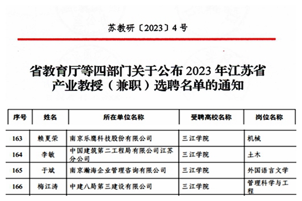 近日,江苏省教育厅、江苏省人才工作领导小组办公室、江苏省科学技术厅、江苏省人力资源和社会保障厅联合下发《关于公布2023年江苏省产业教授(兼职)选聘名单的通知》(苏教研〔2023〕4号),best365官网机械与电气工程学院推荐的南京乐鹰科技股份有限公司赖夏荣,土木工程学院推荐的中国建筑第二工程局有限公司江苏分公司李敏,中建八局第三建设有限公司梅江涛,外国语学院推荐的南京翰海企业管理咨询有限公司于斌等4位企业专家成功入选江苏省2023年产业教授(兼职)。这标志着best365官网在推进产学研深度融合和校企合作方面取得新进展。