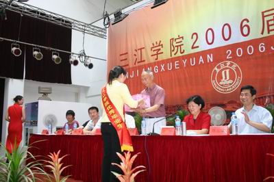 6月21日、22日上午,2006届毕业生毕业典礼在文体馆多功能厅隆重举行,1001名专科毕业生和521名三江首批本科毕业生分三场参加典礼。校领导、各院系领导、各职能部门负责人、各院系班导师出席,主席台上橙红色会标庄重而热烈,校领导和相关院系主要负责人在主席台就坐,优秀毕业生斜披鲜红绶带坐成会场右侧前方一片鲜亮的风景。典礼由叶俊副校长主持,典礼开始时,全场起立,奏国歌。全场落座后,陈云棠副校长宣读了学校文件——《关于授予牛舒牧等144名同学2006届优秀毕业生荣誉称号的决定》,之后,优秀毕业生代表依次走上主席台,从校院(系)领导手中接过荣誉证书,陈万年校长还向毕业生代表赠送了学校给毕业生的礼物,英语系牛舒牧同学、电气与自动化工程学院青年教师陈海霞等毕业生和教师代表在三场毕业典礼上发言。