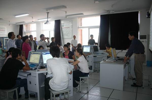 (专家组成员和各院系有关人员在网络实验室听取介绍 摄影/宋常铁)