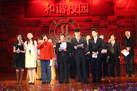 “天时人事日相催,冬至阳生春又来。”在这新旧交汇之际,由学校叶俊副校长领导,校工会主办的全体教职员工迎新春联欢会于1月20日下午在文体馆多功能厅举行。联欢会现场张灯结彩,欢声笑语,洋溢着喜庆、和谐的气氛。联欢会以“和谐校园”为主题,异彩纷呈、赏心悦目的文艺节目把联欢会的气氛推向一个又一个高潮。