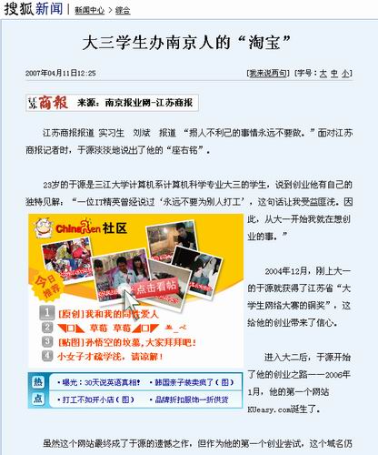 于源利用自己的专业特长,通过对网络的钻研,在网络上创办了“三香电子商城”。这是一个为顾客和供货商在网络上建立交易平台的网站,其功能、模式与“淘宝网”、“易趣”网相仿,但该网站针对的主要是南京市场,地域性明确。4月1日正式运营后,短短十天已有20多人前往洽谈业务,电子商城的点击率已过千,并且于源的创业已在《江苏商报》上刊登,引起了社会的关注。