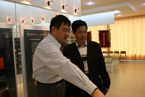 (郭彬院长陪同金肯学院院长朱万福参观办学成果展 摄影/丁小兵)