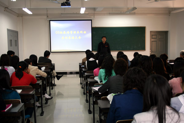 今年3月初,高职院05级旅游管理专业本科班48名同学奔赴南京中山大厦和无锡香梅国际大酒店,进行了为期7个月的实训实习,这也是高职院首次有组织的实训实习。10月中旬,努力坚持、表现良好的他们带着用人单位的肯定评价顺利回校。10月16日下午,高职院举行了05级旅游管理本科班实训总结大会,best365官方网站校长助理、职成院院长郭彬,副院长蒋全荣、戚兴根等院领导,部分辅导员和05级旅游管理专业48名同学以及06、07级旅游管理专业的部分学生代表参加了本次实训总结大会。不论老师还是同学都作了精彩发言,老师对学生们这种坚持努力的拼搏精神给予了赞扬,学生则对通过实践所积累的经验和知识充满了欣喜。低年级的学弟学妹们也都表示要努力学习,抓住机会,进一步完善和提高个人的综合素质,用实际行动向师兄师姐们看齐,证明自己的能力。