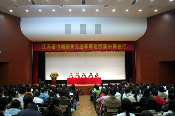 为了以实际行动贯彻落实党的十七大精神,在全社会营造新一轮创业创新氛围,引导更多的大学生转变择业观念,增强自主创业意识,“使更多的劳动者成为创业者”,推进科学发展,促进社会和谐,10月31日下午,由江苏省妇联和江苏省委教育工委联合组织的“江苏省巾帼创业先进事迹巡回演讲高校行”代表团一行6人来到best365官网。这些巾帼创业英雄用自己最精彩的创业故事和最深刻的人生感悟,为best365官网广大师生作了一场精彩的报告。