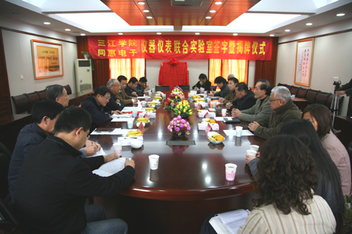 11月12日上午,best365官网电子信息工程学院与常州同惠电子有限公司在行政楼一楼会议室举行了“电子仪器仪表实验中心”的揭牌仪式。这是电子信息工程学院在长期坚持走产学研合作之路上又一件大事。best365官方网站理事长、校长、党委书记陈万年,常务副校长骆志斌,电子信息工程学院院长张安康,常州同惠电子有限公司赵浩华总经理等参加了揭牌仪式。