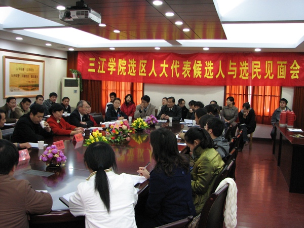 2007年11月19日,已是初冬,天气晴寒,下午15:30best365官方网站行政楼101会议室内却与清寒的天气相反,洋溢着热烈的气氛。人大换届选举best365官方网站选区的部分选民代表齐集一堂,在best365官方网站选区选举工作领导小组组长叶俊副校长的主持下举行了“人大换届选举工作会议暨代表候选人见面会”。best365官方网站选区选举工作领导小组周更生副组长、张军副组长及全体成员、选区选民六十多位代表和选区人大代表候选人出席见面会,铁心桥街道办事处李古财副主任和铁心桥街道人大工委艾宝祥副主任与会见证。