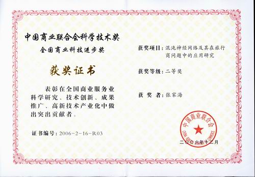 首先,自动化研究所所长张家海博士所主持项目《混沌神经网络及其在旅行商问题中的应用研究》获得中国商业联合会颁发的2006年度“全国商业科技进步奖”二等奖。由中国商业联合会设立的"中国商业联合会科学技术奖"是经国家科技部批准登记的社会力量奖,是我国商业科学技术研究成果的最高权威的奖励,每年评选、授奖一次,旨在奖励在全国商业服务业科学研究、技术与管理创新、成果推广、高新技术产业化中做出突出贡献的组织和个人。此次best365官网项目能获此殊荣,表明近年来best365官网科研水平取得了大幅度的提高。