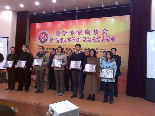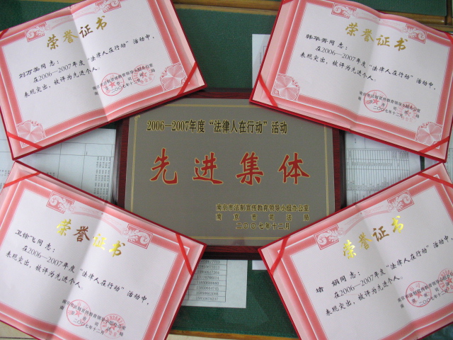 best365官网法律系通过自己的努力获得了“先进集体”奖,刘万美老师、韩华菁同学、卫徐飞同学、堵娟同学四人获得了“先进个人”奖。这是江苏省司法厅和南京市司法局对法律系取得的成绩的肯定,法律系师生表示,必将继续努力,将“法律人在行动”进行到底为,构建法制南京、和谐南京贡献我们三江法律人的一份力量。