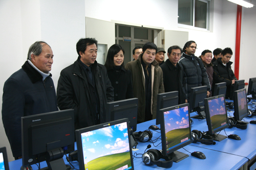 合影留念后,张益董事长一行在王芝庆副校长的带领下,兴致勃勃地参观了计算机系的试验室。先进的实验室和教学设备赢得了客人们的赞许。