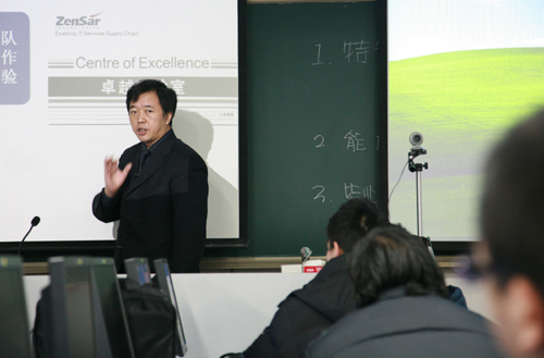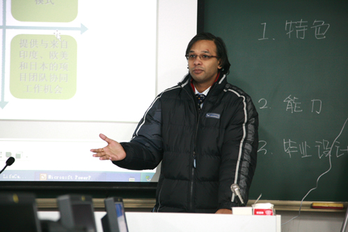 17日上午,在计算机系317实验室,举行了卓越实验室的开放展示仪式。张益董事长向在座的师生简要介绍了卓越实验室的功能及特色等情况。随后,王芝庆副校长用英文向在座的学生作动员讲话。卓越实验室印方代表MR ATIN向学生介绍了卓越实验室在印度的发展情况与取得的成绩,以及卓越实验室在软件人才教学与培养中的作用,他还对在座的学生提出了几点学习要求与建议,并预祝同学们今后在软件领域取得成功。
