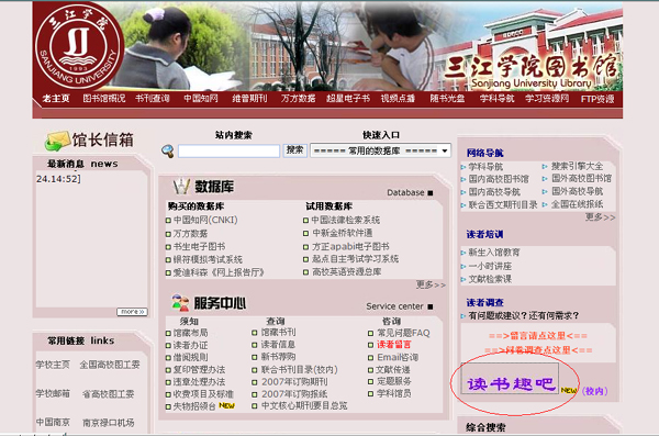 该平台紧紧围绕“体现三江特色,提升文化品位,反映读书生活,积淀思考感悟”的办网方针展开。栏下特设:精品书推荐、热点话题、读书人、书巷子、电影弄、走走看看、淘淘巷等。积极发挥着图书馆与学生信息沟通的桥梁的作用。